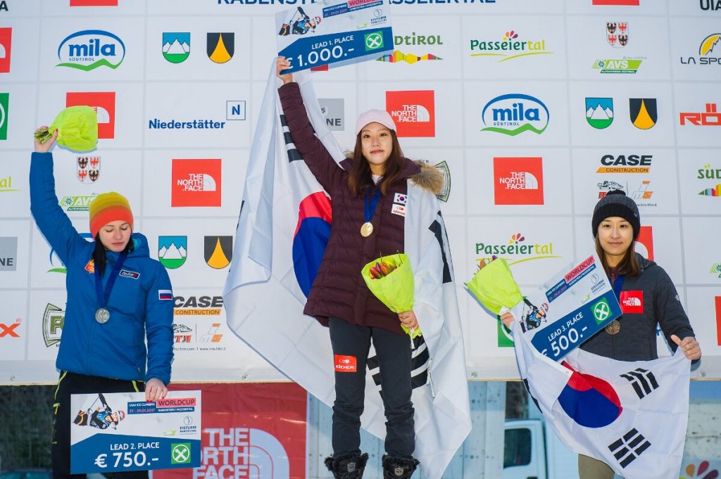 Siegerprodest Damen beim Eiskletterweltcup 2017 in Rabenstein (c) Patrick Schwienbacher