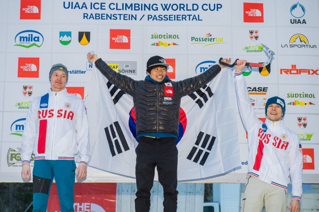 Siegerprodest Herren beim Eiskletterweltcup 2017 in Rabenstein (c) Patrick Schwienbacher