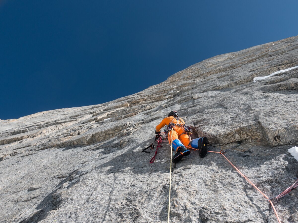 Endlich Sonne und ein wenig wärmer! Stephan Siegrist im Vorstieg der 2. Seillänge, A3. (c) Timeline Productions
