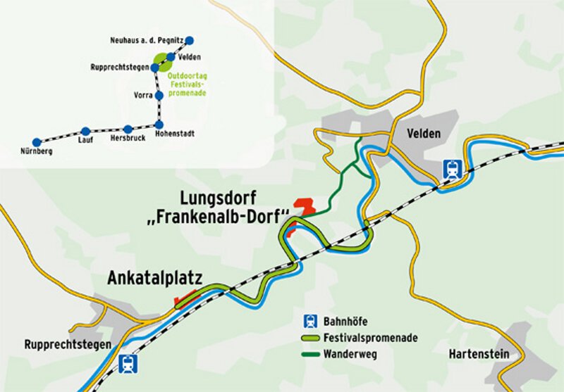 Da der Outdoortag schon jetzt in aller Munde ist und es deshalb zu Engpässen bei den Parkplätzen kommen kann, empfiehlen die Veranstalter eine Anreise mit öffentlichen Verkehrsmitteln. Alle Züge werden mit zusätzlichen Wagen verstärkt, außerdem fahren Sonderzüge. Die Festivalpromenade liegt perfekt zwischen den Bahnhöfen Rupprechtstegen und Velden und kann von beiden Seiten bequem zu Fuß erreicht werden. Die Festivalspromenade durch das Pegnitztal ist von Pfingstsonntag, 15 Uhr bis Pfingstmontag 20 Uhr für den Kraftfahrzeugsverkehr komplett gesperrt.