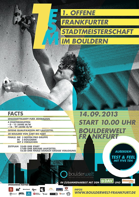30 innovative Boulderprobleme in den verschiedensten Schwierigkeitsstufen werden in der Boulderwelt Frankfurt geschraubt sein, die es ab 10 Uhr innerhalb von sieben Stunden zu lösen gilt. Gewertet wird die Versuchsanzahl, die Schwierigkeit des Boulders und wie weit man im Boulder gekommen ist. Dabei treten die Teilnehmer in zwei Altersklassen an: Kinder und Jugendliche bis 15 Jahren und Erwachse ab 16 Jahren.