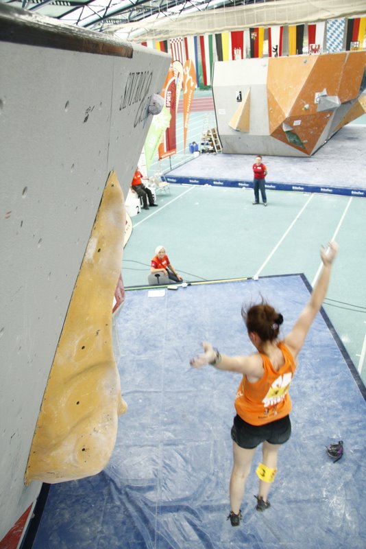 Bei den Damen konnte man einige neue Gesichter im Starterfeld sehen, die man so noch nicht oder jedenfalls noch nicht so oft auf den deutschen Bouldercups wahrgenommen hat. So konnten sich bei den Damen Annika Pidde (Frankenthal), Afra Hönig (Landshut) und Jana Müller (Hamburg und Niederelbe) über ihren ersten Finaleinzug freuen. Dieses Trio wurde komplettiert durch finalbekannten Katrin Lau (Frankenthal), Julia Winter (Sächsischer Bergsteigerbund) und Monika Retschy (München-Oberland).