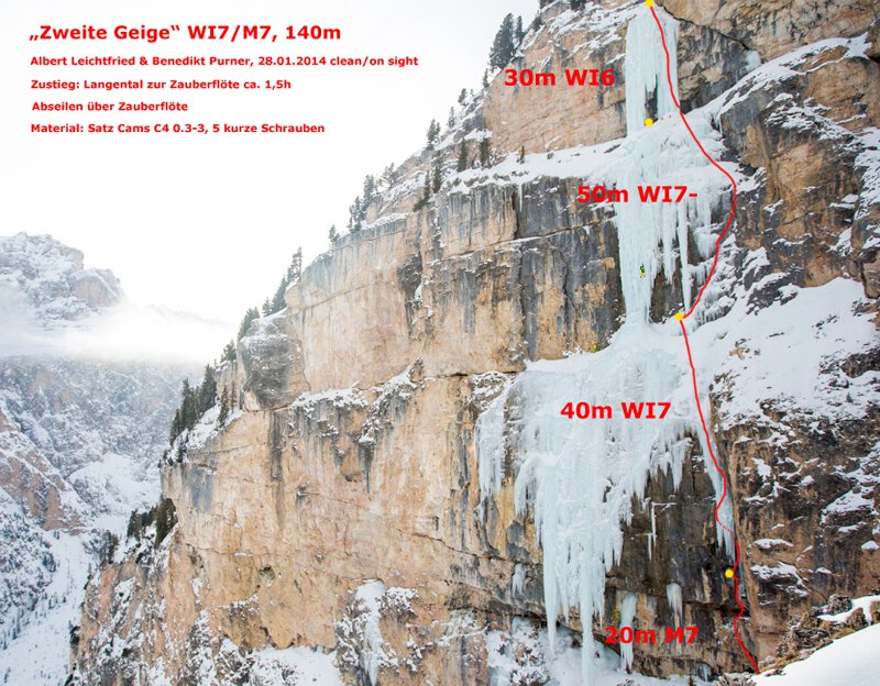Zum anderen sollte jede Bewegung gut überlegt sein, an den fragilen und instabilen Eisformationen. Als Benny mit einem Grinsen im Gesicht zum Stand nachkommt, meinte er nur: "Ein Siebener im Eis ist im Nachstieg doch deutlich angenehmer zu klettern." Doch schon in der nächsten Länge muss auch er alles geben. Eine dünne und schlecht abzusichernde Glasur fordert ihn aufs Neue. Als Abschluss wartet noch die freistehende Säule von der Zauberflöte und machen die "Zweite Geige" zu einer ernsten, aber doch sehr interessanten Linie mit sehr hohem Eisanteil – ohne Bolts und ohne Haken – also clean.