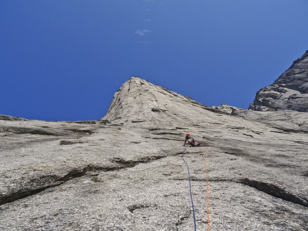 Am 9. Juli erreichten die Kletterer das als Herz bezeichnete Biwakband. Ab dort wird die Wand deutlich steiler und exponierter. Schwierige, exponierte und auch hier teilweise schlecht absicherbare Passagen forderten die Seilschaft. Am 9. Juli biwakierten die zwei an einer exponierten Stelle im Portaledge, 6 Seillängen vor dem Gipfel. Doch am nächsten Morgen begann es zu schneien und die Temperaturen fielen drastisch. Aus Mangel an Verpflegung konnte das schlechte Wetter nicht abgewartet werden und es blieb nur der Rückzug.