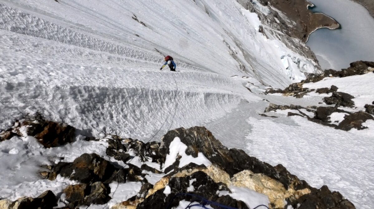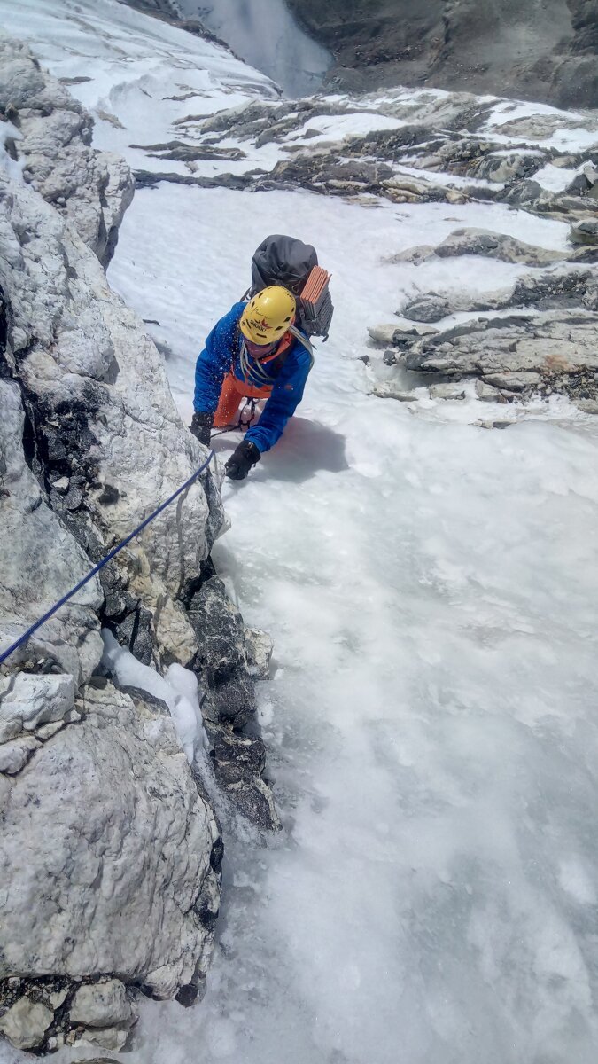 «Die ersten Meter begrüssten uns mit unangenehmem Mix-Klettern, das mit einer schräg verlaufenden Rampe fortsetzte. Wir stiessen an einen sehr schlechten Felsen mit nicht kompaktem, lockerem Schnee, der an Zucker erinnerte», so schildert Marek die ersten Meter.