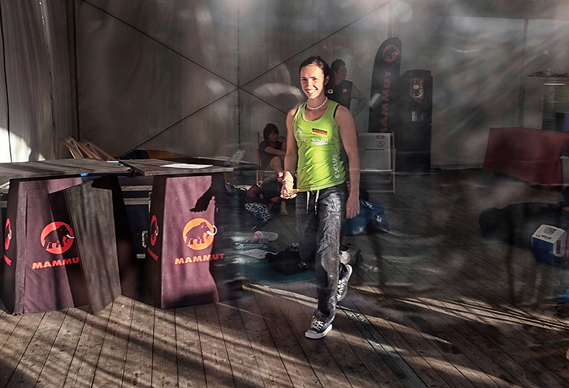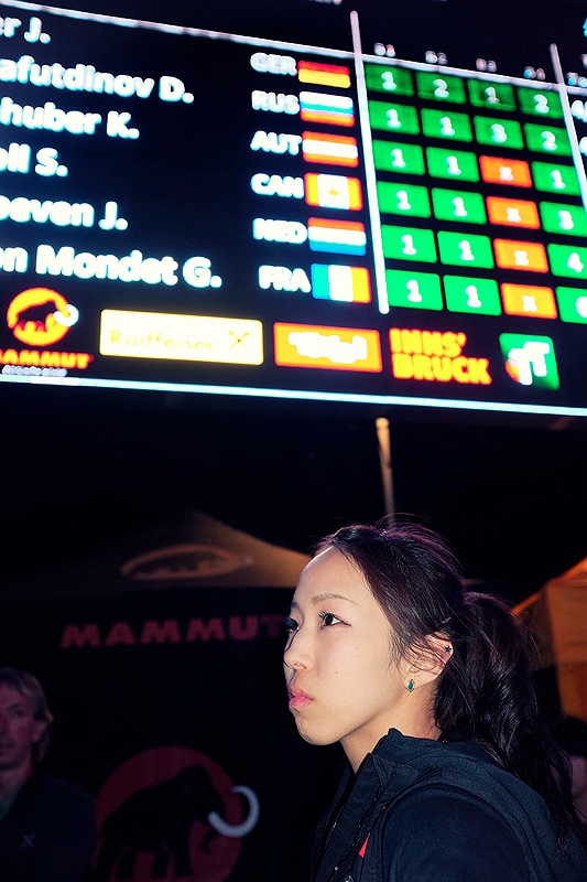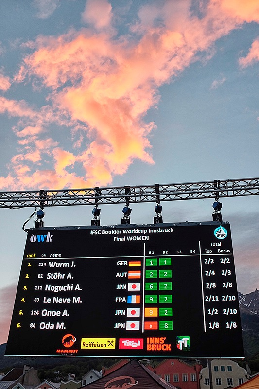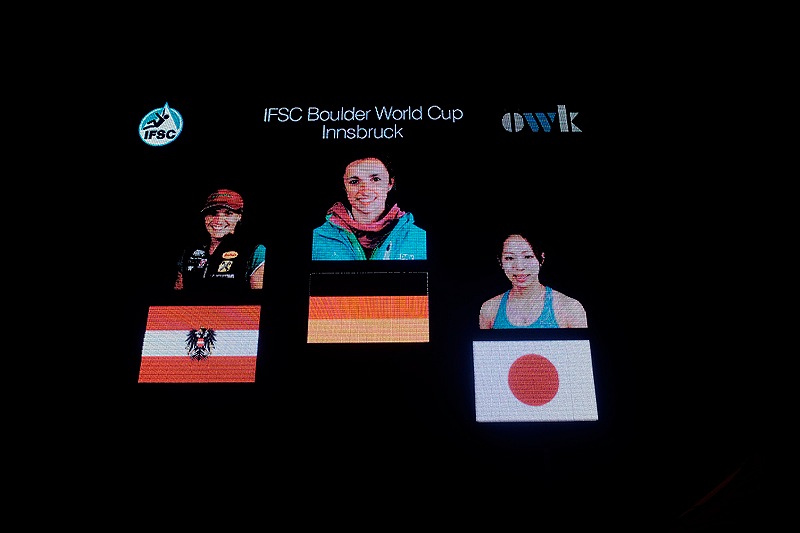 An einem sehr flachen Griff stürzte sie fast, hielt sich aber dank großer Körperbeherrschung mit drei Fingern an der Wand. Dank dieser beeindruckenden Demonstration gewann Juliane Wurm mit nur einem Versuch weniger vor Anna Stöhr. Damit ist es der 6. Platzierten im Gesamtweltcup gelungen, die Siegesserie der Österreicherin ausgerechnet bei ihrem Heimweltcup zu brechen.Den dritten Platz holte Akiyo Noguchi aus Japan. Auch erfreulich aus deutscher Sicht: Bei ihrem ersten Weltcup machte Ana Tiripa vom DAV Rheinland-Köln mit dem Einzug ins Halbfinale und einem guten 19. Platz in der Tageswertung auf sich aufmerksam.