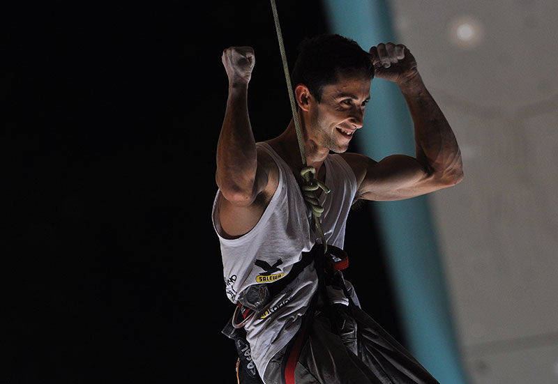 Three to go. Needless to say the three athletes everyone was waiting for. Jacob Schubert climbed up like a rocket. Effortlessly, safe every step of the way, even through the immense roof. He seemed predestined to reach the top and easily clinched the finishing hold, like a true champion. Next out was Adam Ondra and expectations were running high for this athlete who is changing the face of climbing. He wanted that top more than anyone else and in what seemed like a foretold script he breezed upwards to 4 holds beneath the „Verhoeven & Chernikov“ mark and… his foot slipped. Ondra fell, bitterly disappointed.But there was no time to stop and think: Puigblanque was roaring to go. The Lead World Champion knew full-well that only the finishing hold would secure victory… Now, can you imagine a man without weight? Yes, as he forged his way up the Catalan climber really did seem on a different planet, in a world without gravity. His ascent was another masterpiece and he won, yet again. His and Eiter's were perfect climbs: two tops on two routes. And just like Eiter, this was Puigblanque's 6th Rock Master gold. No one ever before has done better than them.