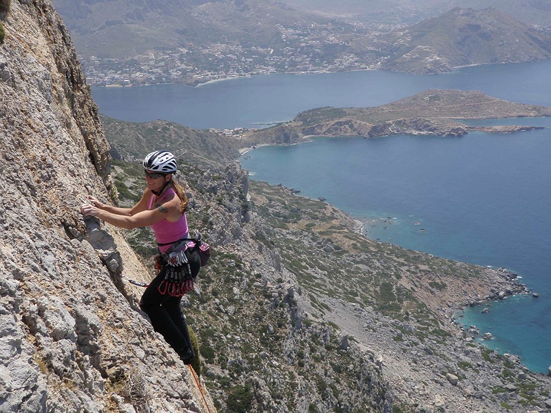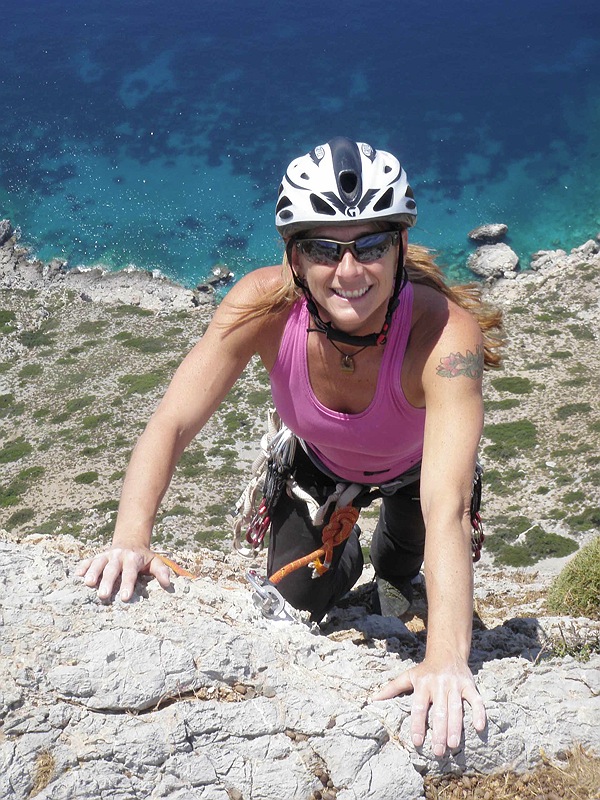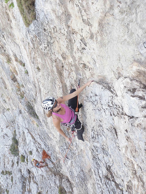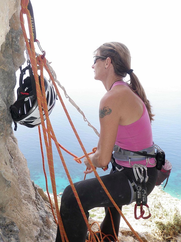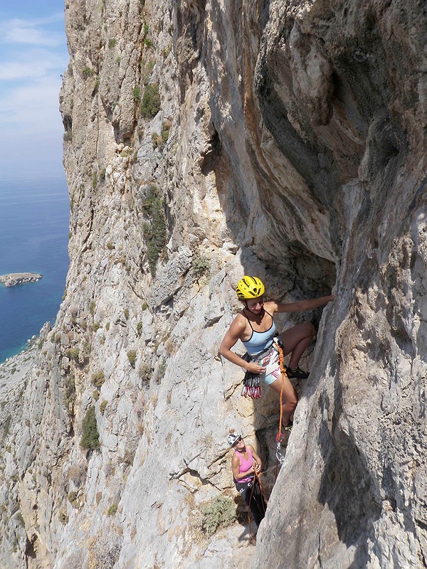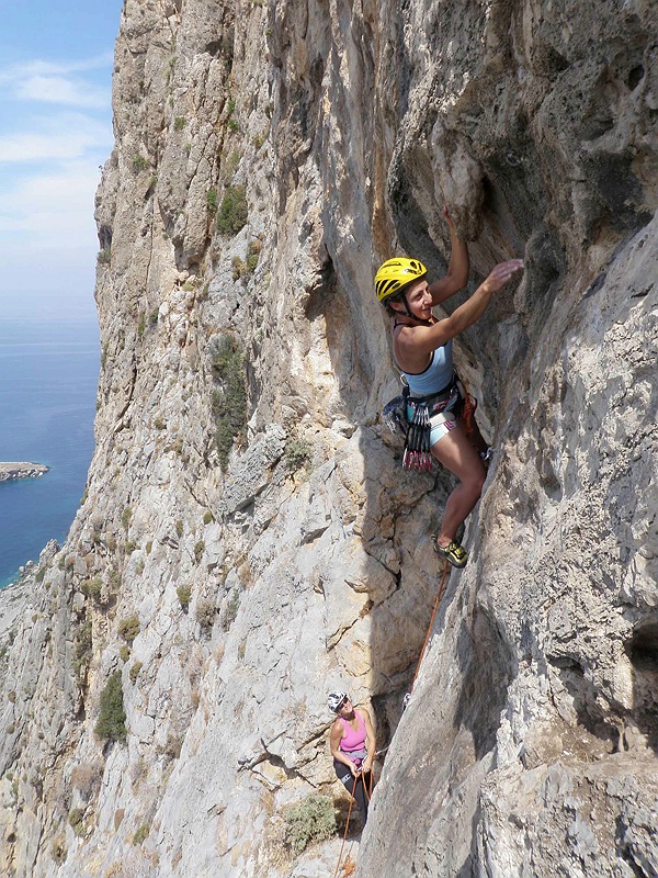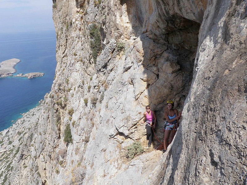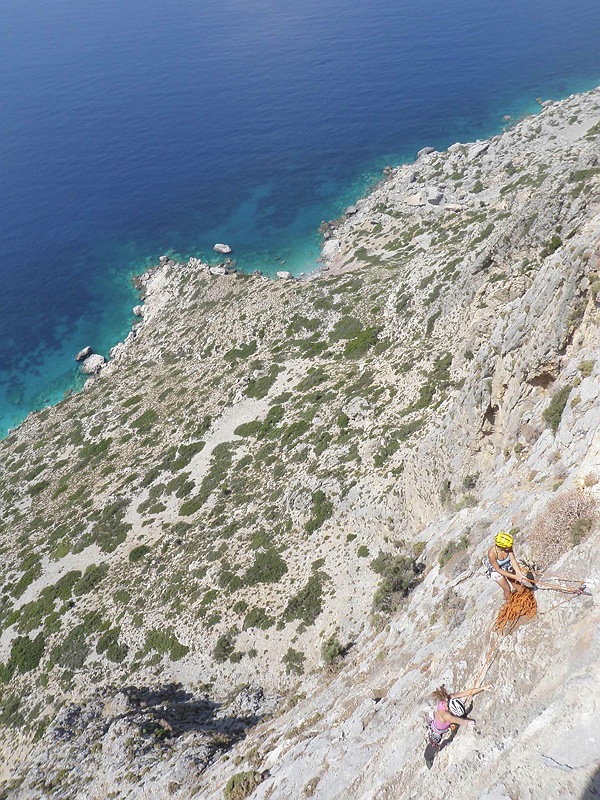 Mit Tanja Mansuka von der Nadir Rock Bar und Monica Sanchez, der besten Masseurin rund ums Mittelmeer haben wir eine tolle Truppe für die erste Wiederholung bereit. Tatsächlich macht der Durchstieg in einem Zug großen Spaß und die Mädels freuen sich darüber, der Tour die erste Team on sight Begehung abgerungen zu haben. Bis wir uns im Gipfelbuch eintragen wollen.Da sind uns doch tatsächlich 3 Engländer zuvorgekommen und haben sich den ersten Durchstieg an unserem Ruhetag geschnappt. Unglaublich, da erzählen sie einem jeden Abend dass die schönsten Klettereien in Yorkshire zu finden sind und trotzdem treffen wir die Herren regelmäßig in Griechenland. Wie auch immer, die Tour gefällt und schon nach einer Woche wird sie rund 20! Mal wiederholt.