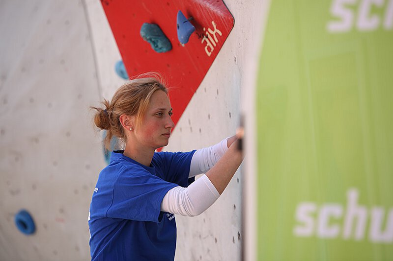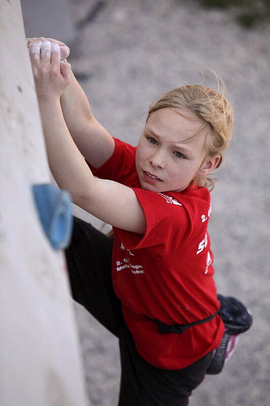 Auch bei den Mädels war eine Klettererin aus Franken ganz vorne: Helena Bezold (Erlangen) lieferte sich im Finale ein Kopf an Kopf-Rennen mit Luisa Brumma vom Wettkampfkader 2 von München & Oberland. Beide Mädels kletterten unter vollem Einsatz bis zum Top. Ein Beweis für die guten Schrauberqualitäten, denn die beiden unterscheiden sich erheblich in Körpergröße, Kletterstil und Lebensalter und galten jeweils als stärkste in ihrer Klasse. Die Wettkampferfahrene und routiniert auftretende Helena lag jedoch in der Quali um 4 Punkte vorn und machte damit verdient Platz 1 in der Tageswertung. Sie gilt auch als ganz heiße Favoritin für den Sieg beim Oberlandcup. Valentina Merget (München & Oberland) wurde Gilchinger Meisterin bei den Mädels.