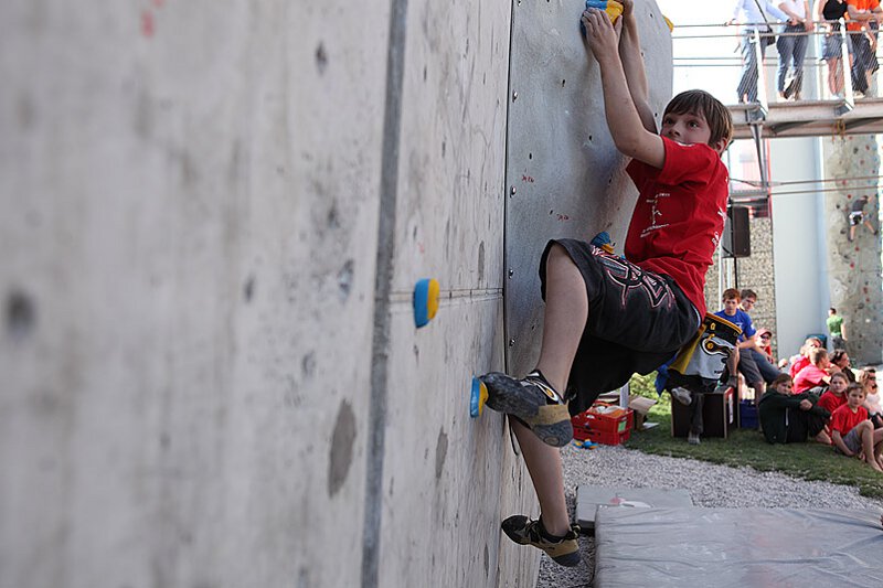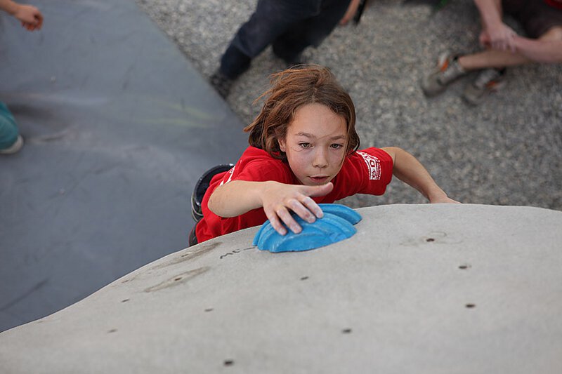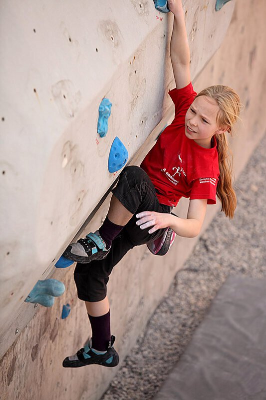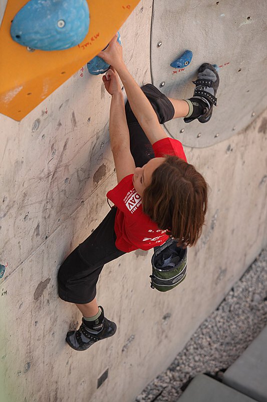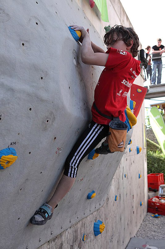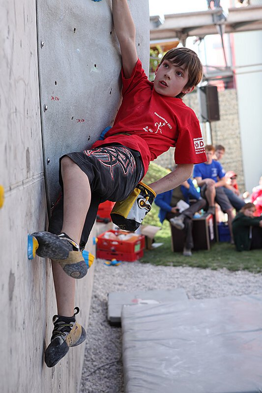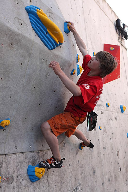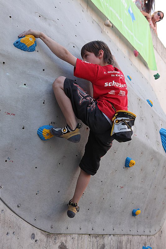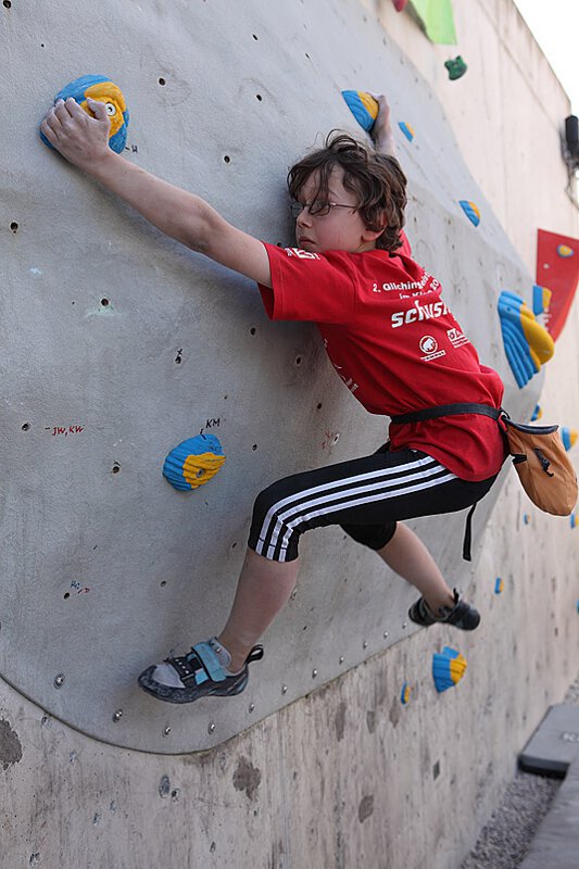 Moritz Perwitzschky (Erlangen) ebenfalls ein Franke, der zusammen mit seinem Vater teilnahm, wurde seiner Favoritenrolle voll gerecht. Mit sieben Griffen Vorsprung wurde er zu Recht Erster bei den männlichen Kindern, eine etwas schlampige Tritttechnik kostete ihn das Top über besagter Riesenkugel, das er sonst als einziger seiner Klasse erreicht hätte. Auf der Münchner Stadtmeisterschaft muß er jedoch mit dem in Gilching zweitplatzierten Marco Alder, dem jüngsten Neuzugang des Wettkampfkaders 2 von München & Oberland rechnen. Marco lag außerdem auf dem CLIMB FREE noch zwei Plätze vor Moritz. Guillermo Urzua ein weiterer Bamberger, der schon seit einigen Jahren bei den Oberlandwettkämpfen recht erfolgreich startet machte einen ausgezeichneten 3. Platz. Die Franken waren in der Kinderklasse also ganz stark dabei. Gilchinger Meister in der Kinderklasse wurde Nicolas Grein (München & Oberland).