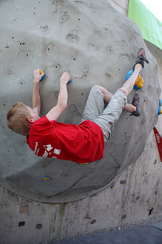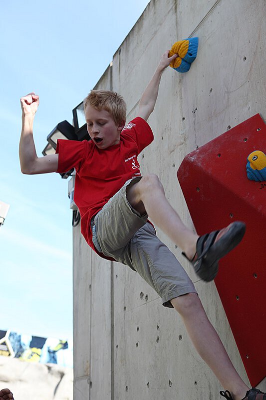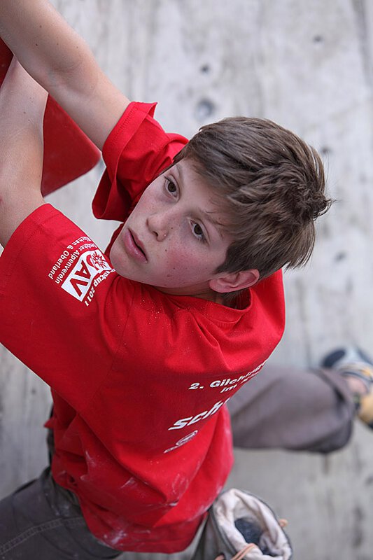 Moritz Perwitzschky (Erlangen) ebenfalls ein Franke, der zusammen mit seinem Vater teilnahm, wurde seiner Favoritenrolle voll gerecht. Mit sieben Griffen Vorsprung wurde er zu Recht Erster bei den männlichen Kindern, eine etwas schlampige Tritttechnik kostete ihn das Top über besagter Riesenkugel, das er sonst als einziger seiner Klasse erreicht hätte. Auf der Münchner Stadtmeisterschaft muß er jedoch mit dem in Gilching zweitplatzierten Marco Alder, dem jüngsten Neuzugang des Wettkampfkaders 2 von München & Oberland rechnen. Marco lag außerdem auf dem CLIMB FREE noch zwei Plätze vor Moritz. Guillermo Urzua ein weiterer Bamberger, der schon seit einigen Jahren bei den Oberlandwettkämpfen recht erfolgreich startet machte einen ausgezeichneten 3. Platz. Die Franken waren in der Kinderklasse also ganz stark dabei. Gilchinger Meister in der Kinderklasse wurde Nicolas Grein (München & Oberland).