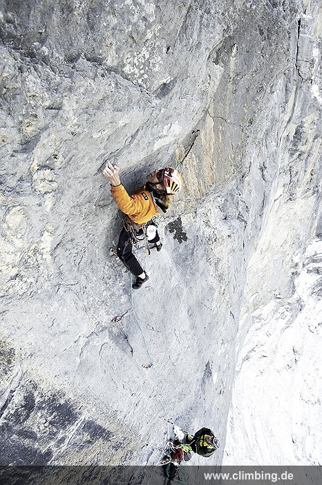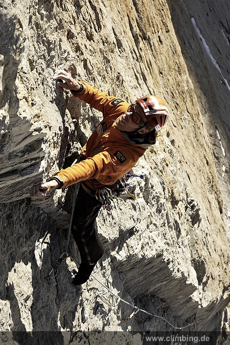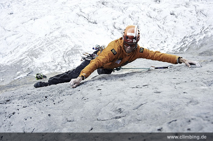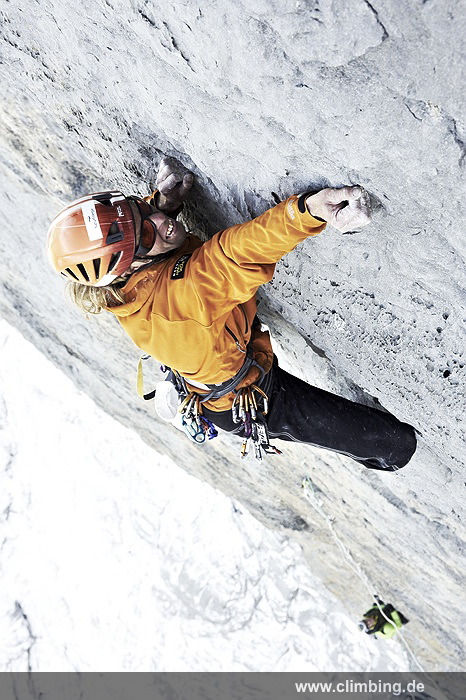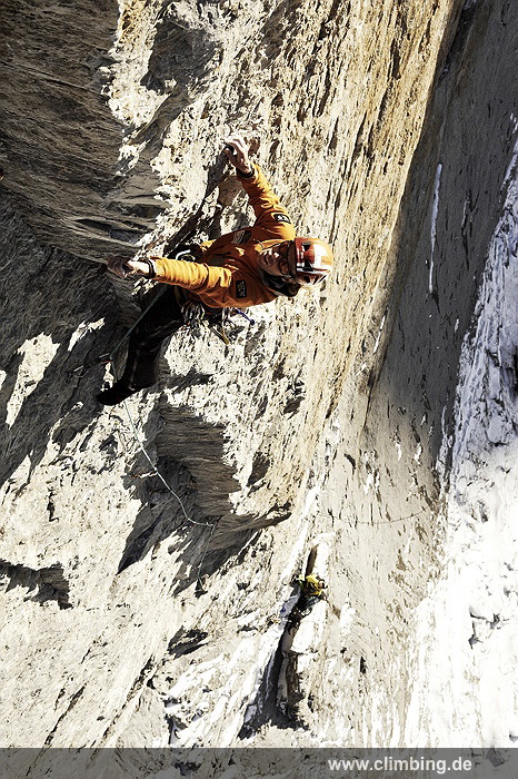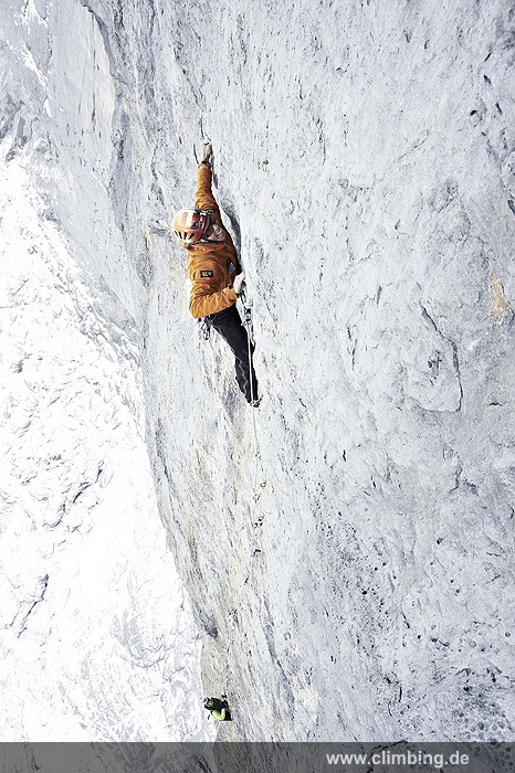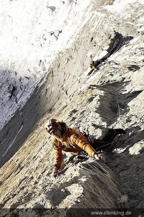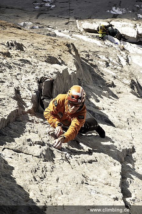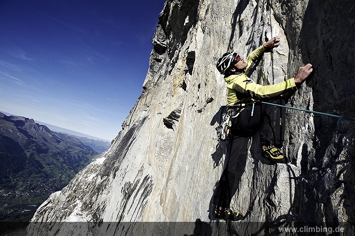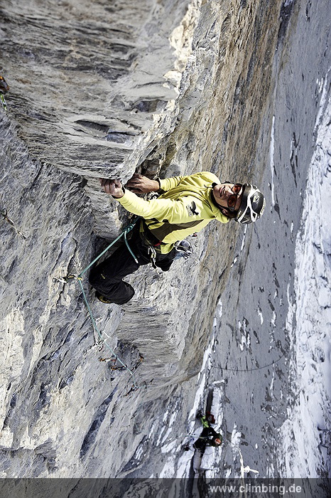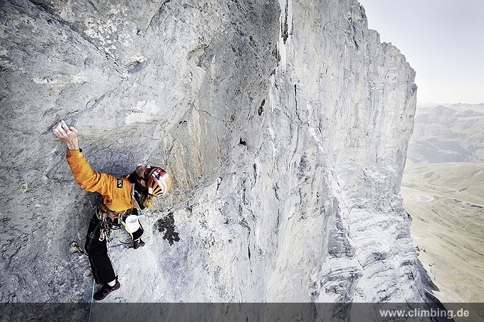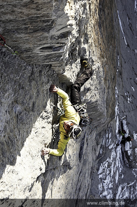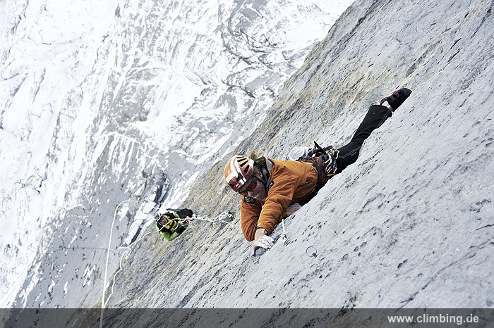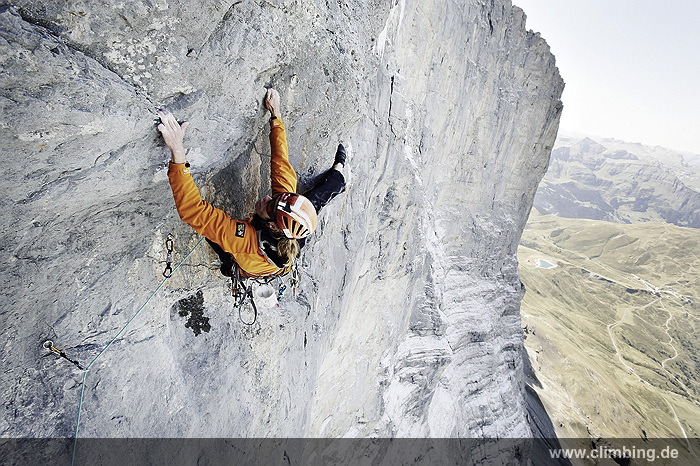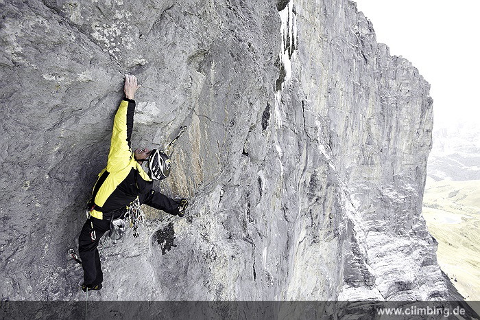 Japaner-Route in der Eiger Nordwand erstmals frei geklettert Die so genannte Super-Diretissima (Schwierigkeitsgrad 10-/8a) ist nun die schwierigste und anspruchsvollste Route durch die berühmte 1800 Meter hohe Eiger Nordwand. Seit sechs Jahren lässt uns dieses Projekt am Eiger nicht mehr los. Immer wieder stiegen Roger Schaeli, mein Schweizer Kletterpartner und ich über den Wandvorbau zu den geschichtsträchtigen Seillängen des Schwierigen Risses und der Roten Fluh hinauf. Die Rote Fluh ist der abweisendste und steilste Wandbereich der gesamten Eiger Nordwand. Unser Ziel war es, die Japaner-Diretissima frei zu klettern. Wir haben es nun, auf den Monat genau zum 40 jährigen Jubiläum der 1969 eröffneten Route endlich geschafft.