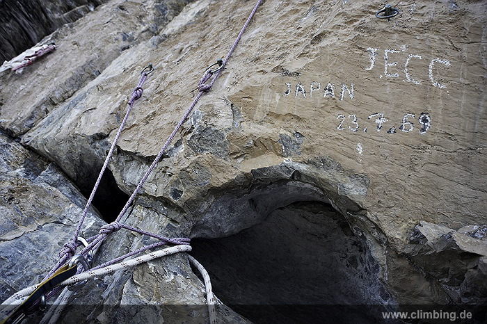 Das JapanischeTeam hatte sich den Berg 1969 in größtenteils technischer Kletterei mit 250 Bohrhaken auf dem Weg „der fallen Tropfen“ an Haken und Leitern empor gearbeitet. Auch Roger Schaeli hatte im Winter 2002 sein „Abenteuer Japaner-Diretissima“ abbrechen müssen.