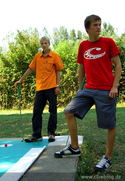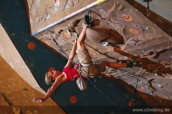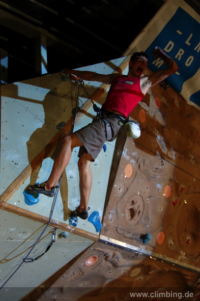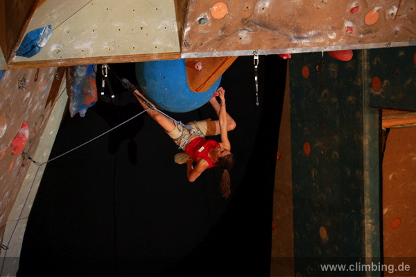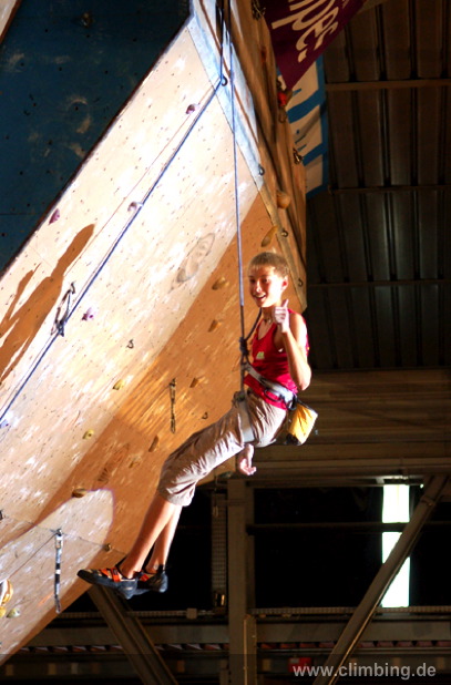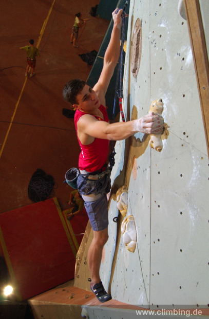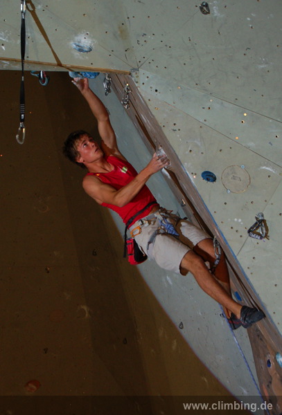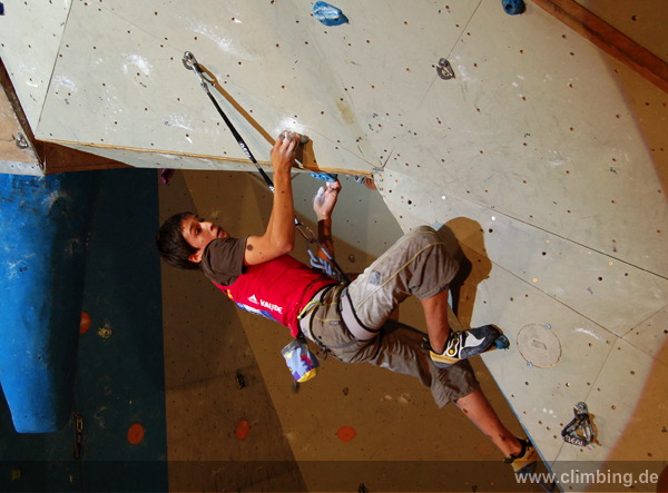 Viel erhofft hatten sich auch die Junioren des DAV: Vor allem Thomas „Shorty“ Tauporn (Schwäb.-Gmünd) war nach zwei Weltcup-Finaleinzügen in Folge topfit und hatte bis zum Finale auch nie Probleme in den Routen – mit den weiteren üblichen Verdächtigen schaffte er es problemlos in die Runde der letzten acht. Hier lief es für ihn locker bis zu einem Tickmark-Überbleibsel aus der Vorrunde, dem er zum Opfer fiel: Die Markierung lotste ihn ins grifftechnische Nichts und ließ ihn aus einem unhaltbaren Untergriff abtropfen.