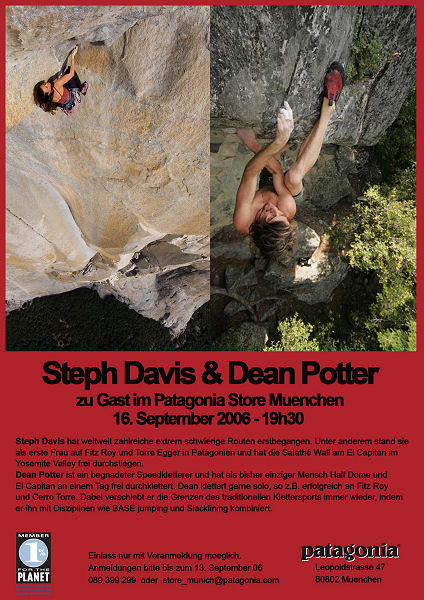Steph Davis & Dean Potter Steph Davis hat weltweit zahlreiche extrem schwierige Routen erstbegangen. Unter anderem stand sie als erste Frau auf Fitz Roy und Torre Egger in Patagonien und hat die Salathe Wall am El Capitan im Yosemite Valley frei durchstiegen. Dean Potter ist ein begnadeter Speedkletteter und hat bisher als einziger Mensch Half Dome und El Capitan an einem einzigen Tag frei durchklettert. Dean klettert gerne solo, so z.B. erfolgreich an Fitz Roy und Cerro Torre. Dabei verschiebt er die Grenzen des traditionellen Klettersports immer wieder, imdem er ihn mit Disziplinen wie BASE Jumping und Slacklining kombiniert. PATAGONIA Einlass nur mit Voranmeldung möglich. Zum Thema: Siehe auch: |