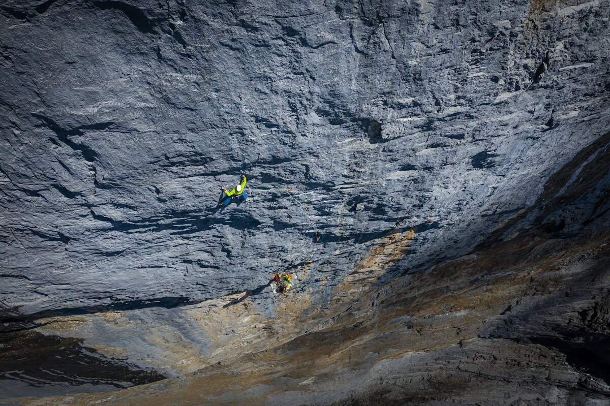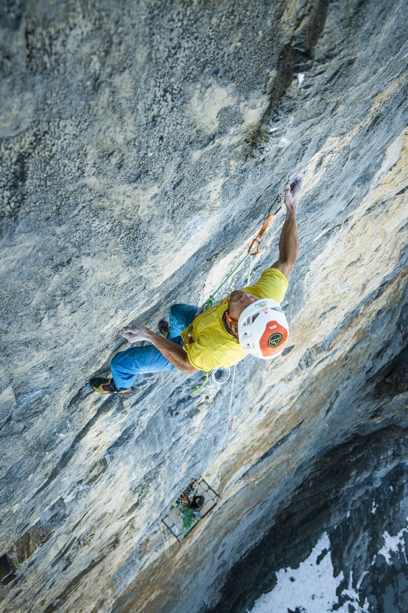 Doch die fünfte Seillänge ist extrem steil und schwer. Nachdem Schaeli nach einem harten Kampf auch dieser Rotpunkt gelingt beginnt aber eigentlich erst der richtig schwere Teil der Tour. In der sechsten Seillänge wartet ein Boulderproblem in der Mitte der Passage, schlecht abgesichert und in stark überhängendem Gelände.