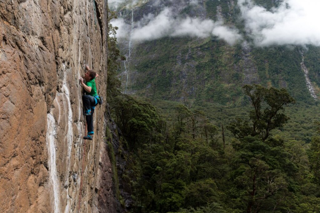 Ein offenes Projekt von Derek Thatcher das er auf den Namen „Nebuchanezzar“ taufte, zog mich in einen Bann. Goldener perfkter Gneiss, leicht überhängende fingerlastige Kletterei, perfekt! Einen Haken hat dieser Teil von Neuseeland: Der Milford Sound liegt in einer der regenreichsten Gegenden der Erde.