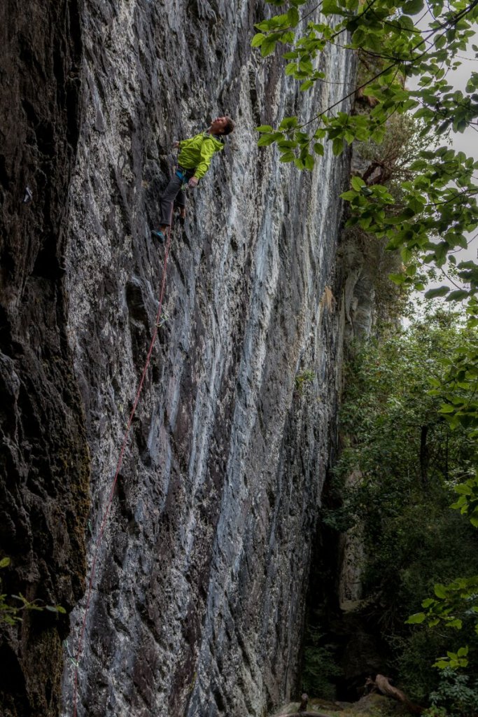 Ziemlich ungeduldig und mit einem bereits durchnässten Sicherungspartner kletterte ich in meinem nächsten Versuch bis zum Stand, fast. Im 7er Gelände schenkte ich meine Begehung noch her… Unbegreiflich ärgerlich, das war`s nun, der Regen wurde immer stärker das Licht immer weniger und die Energie gleich Null.