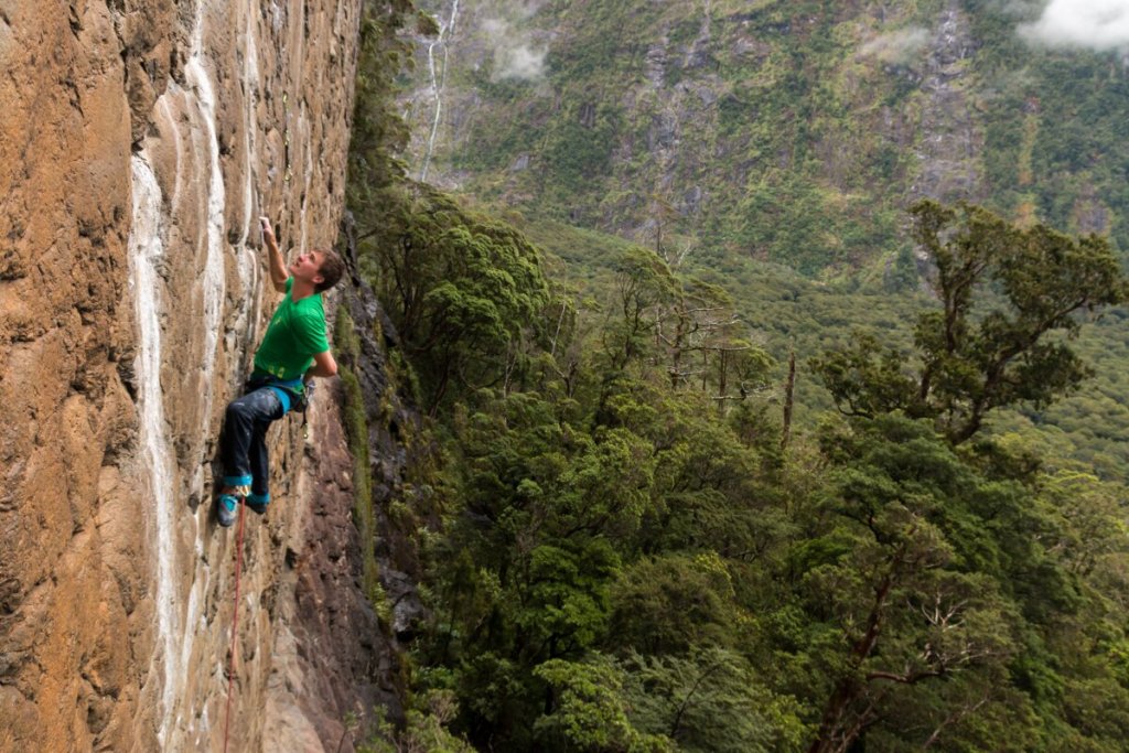 Ein offenes Projekt von Derek Thatcher das er auf den Namen „Nebuchanezzar“ taufte, zog mich in einen Bann. Goldener perfkter Gneiss, leicht überhängende fingerlastige Kletterei, perfekt! Einen Haken hat dieser Teil von Neuseeland: Der Milford Sound liegt in einer der regenreichsten Gegenden der Erde.