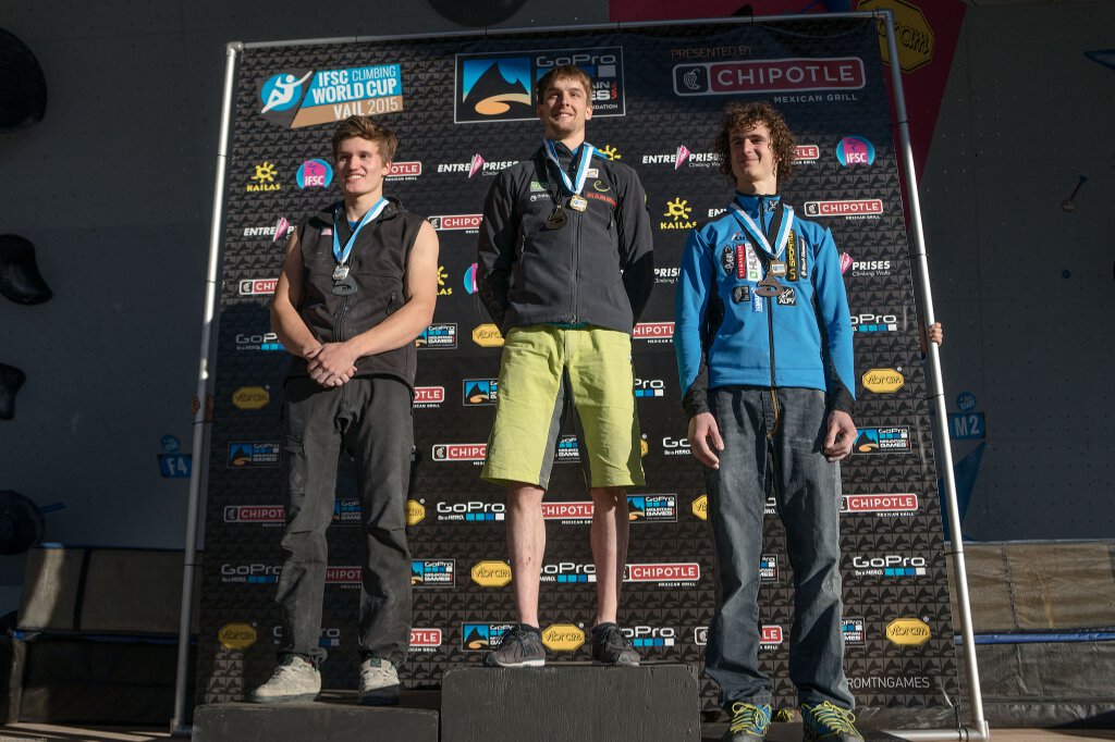 Boulderweltcup 2015 in Vail: Siegerpodest Herren mit Nathaniel Coleman, Jan Hojer und Adam Ondra (c) ISFC/Eddie Fowke – the circuit climbing