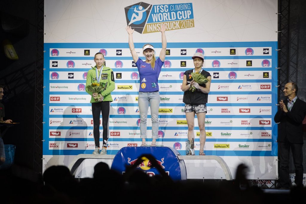 Für die Medaillenränge ist jeweils eine Lösung aller vier Finalboulder nötig: Saison-Seriensiegerin Shauna Coxsey holt sich auch in Innsbruck Gold, Silber und damit ihre erste Weltcup-Medaille geht an Youngster Janja Garnbret aus Slowenien gefolgt von Miho Nonaka (JPN).