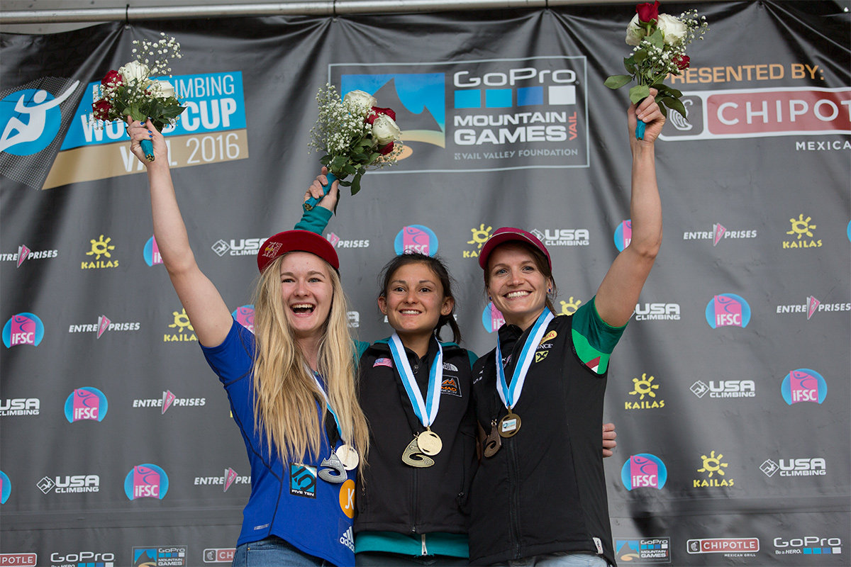 Siegerpodest Damen beim Boulderweltcup 2016 in Vail: Shauna Coxsey (GBR), Megan Mascarenas (USA) und Anna Stöhr (AUT)