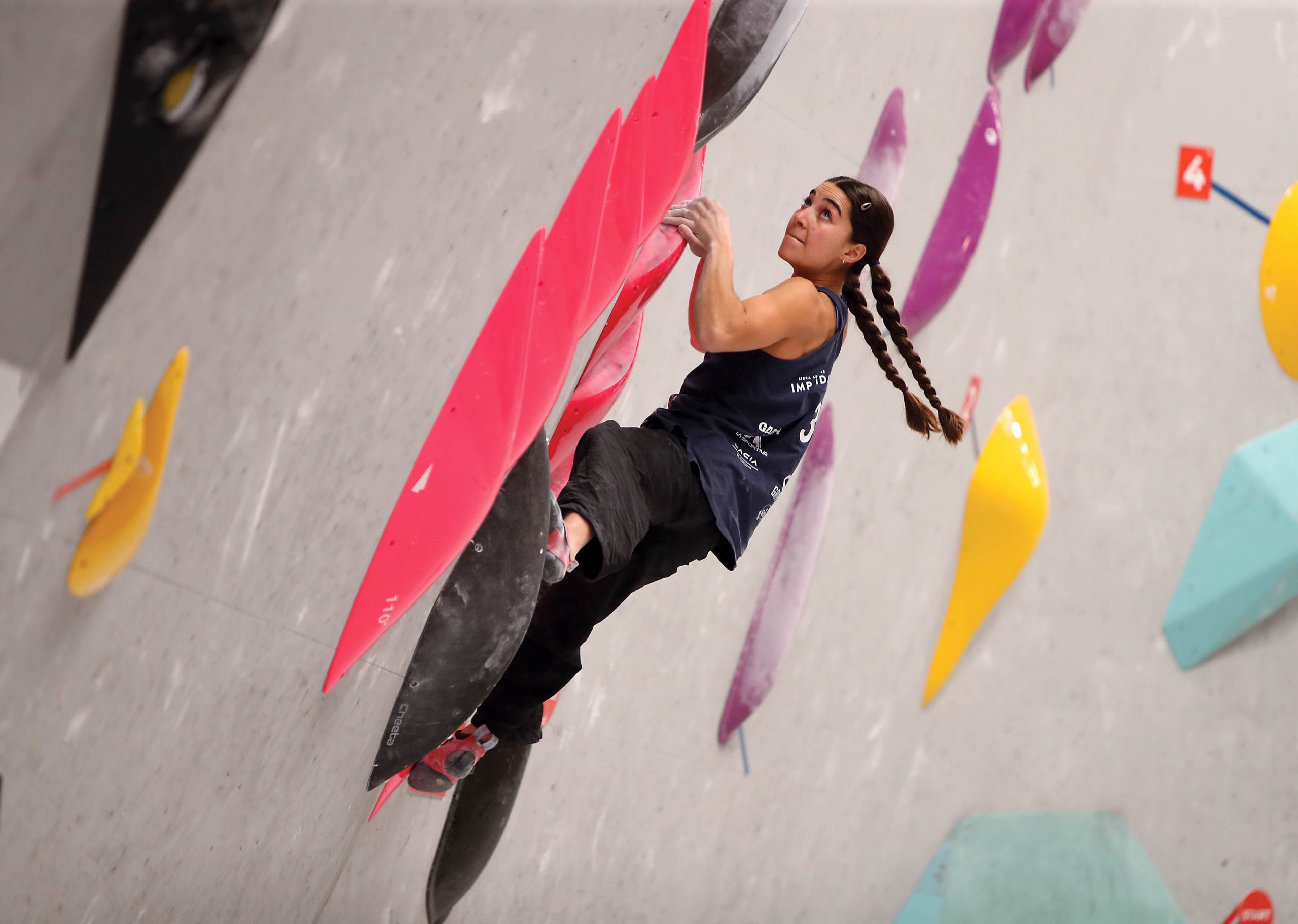 Im Finale kämpften die Kletterinnen Janja Garnbret, Brooke Raboutou und Anna Maria Apel auf dem letzten Boulder um den Sieg. einer echten Herausforderung mit einem Schwierigkeitsgrad von etwa 8b+, einer extremen Passage vom ersten bis zum letzten Griff, die sich für die amerikanischen und deutschen Kletterinnen als schwierig erwies, die es in drei Versuchen nicht schafften, das TOP zu erreichen.
