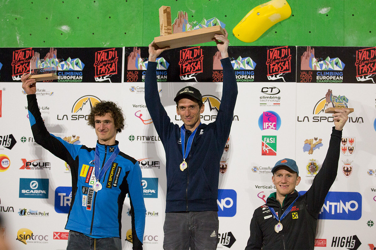 Adam Ondra, Romain Desgranges und Jakob Schubert bei der Lead-EM 2017 (c) KVÖ / Heiko Wilhelm