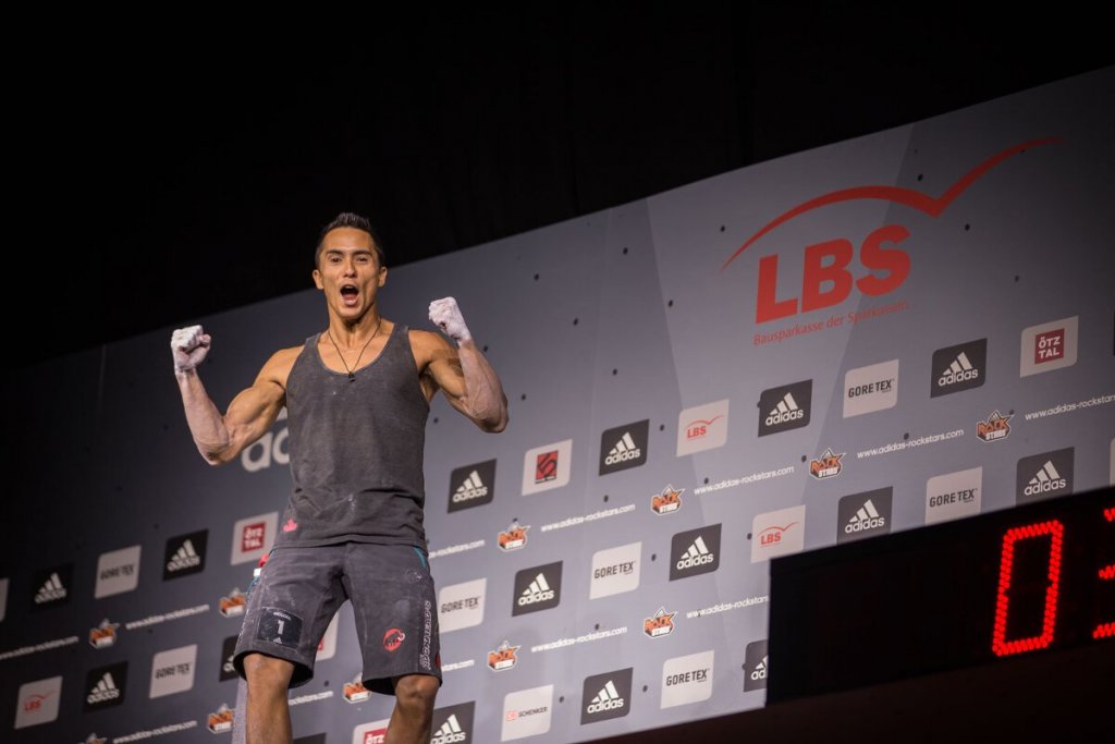 Titelverteidiger Sean McColl (CAN), erreichte sein erklärtes Ziel und schaffte mit seinem dritten Sieg nach 2012 und 2014 den Hattrick. „Als ich den ersten Cut-off in die Top 3 geschafft hatte, musste ich lachen, denn damit hatte ich auf jeden Fall zum vierten Mal in Folge einen Platz auf dem Podium sicher“, so McColl. „Es ist immer aufregend am Superboulder zu klettern. Ehrlich gesagt hatte ich keine Ahnung wie es laufen würde. Ich dachte, wir beide würden den Sprung im ersten Versuch schaffen und dass es wieder ein Rennen auf den Buzzer geben würde. Aber der Sprung war doch ziemlich schwer. Als ich dann die Reaktion des Publikums auf Reis Sturz hörte, habe ich rüber geschaut, um sicher zu gehen, dass er wirklich gestürzt ist. Mir war bewusst, dass es sehr schwer ist, an so einem Boulder aufzuholen, also habe ich mir Zeit genommen, mich entspannt und mir mehr Zeit gelassen also sonst, um das Top zu erreichen. Ich bin nicht gestürzt und das war das Entscheidende. Ich habe einfach versucht, keine Fehler zu machen und durchzukommen.“