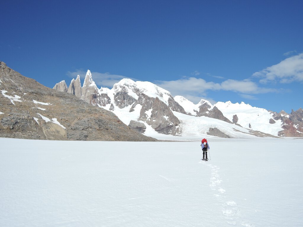 Am zweiten Tag ging es weiter über den Pass und das Inlandeis bis zum Circo de los Altares, wo wir eine weitere Nacht verbrachten. Der Freitag war dann eher gemütlich. Wir stiegen noch zum Biwakplatz unterhalb des Elmos auf und trafen unterwegs im Col de la Esperenza auf eine Slowenische Seilschaft bestehend aus Luka Lindic, Luka Krajnc und Tadej Krišelj, welche von der Adela Überschreitung kamen und am nächsten Tag auch die Ragni Route klettern wollten.