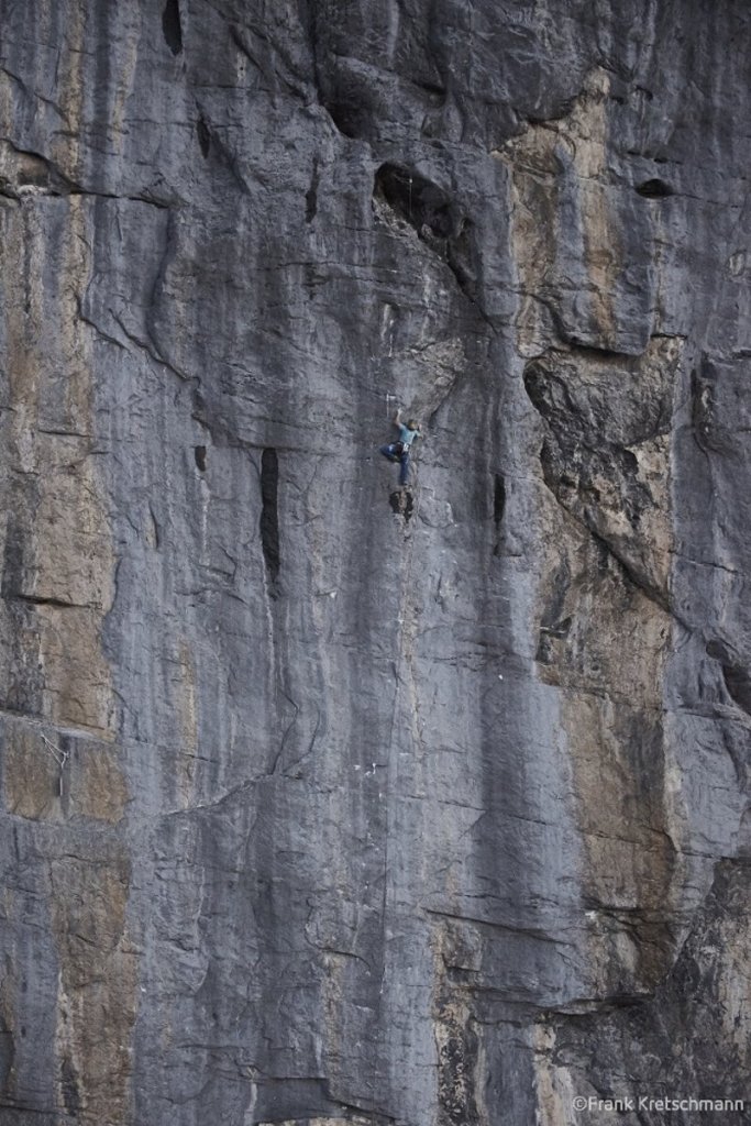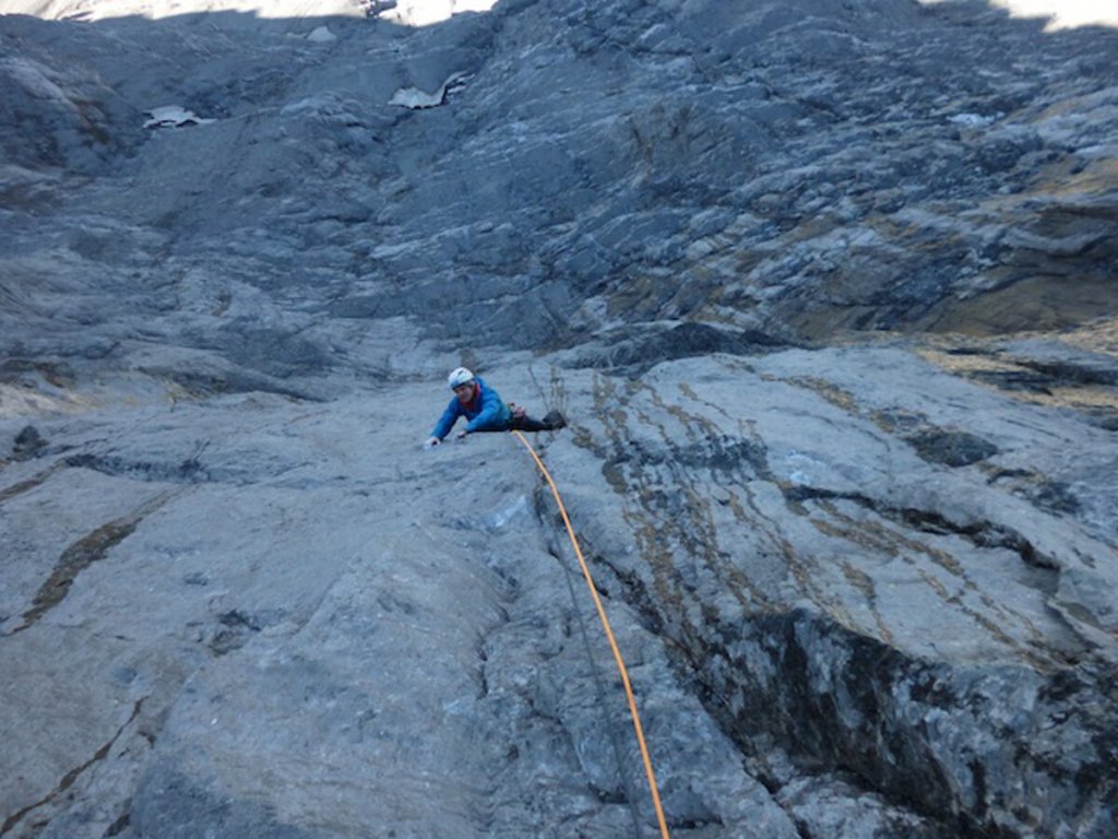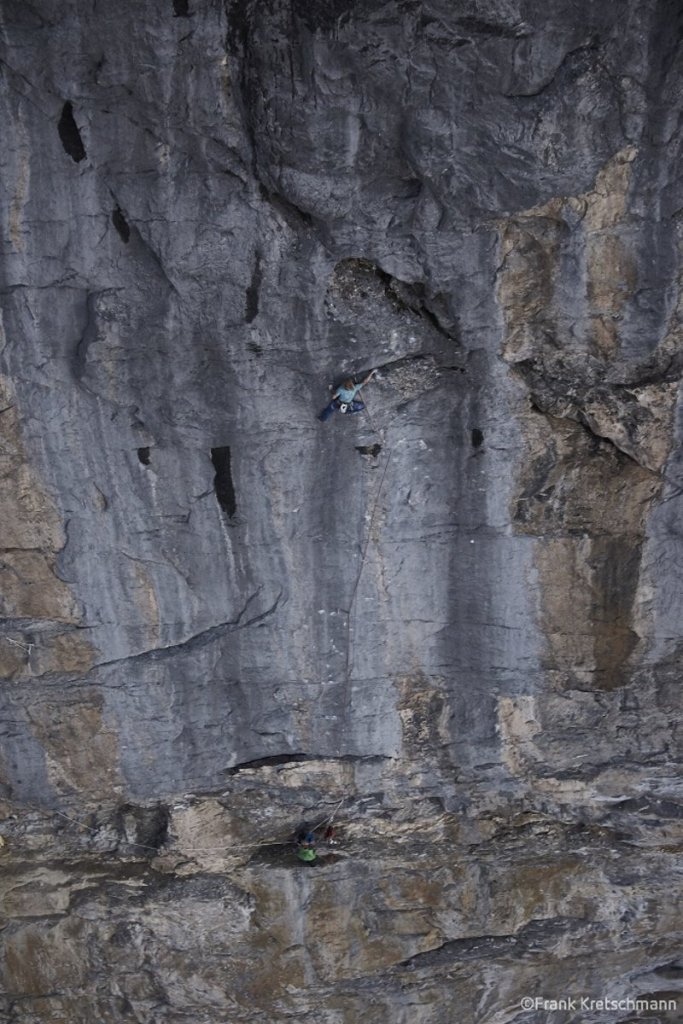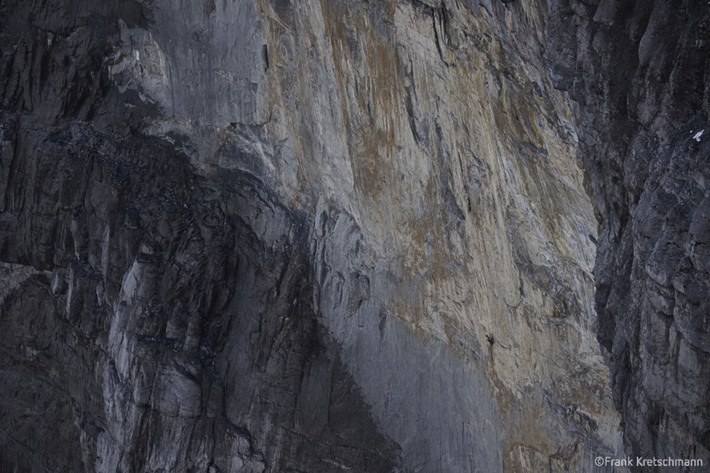 Schäli konnte fast die 8a-Seillänge flashen als unerwartet ein Griff ausbrach. Das Wetter war nicht optimal, Regen und eine sehr feuchte Wand machten eine 7a+ Seillänge sehr schwierig, da sie vollständig durchnässt war. Zwei weitere 7b+ Seillängen waren laut Schäli aufgrund der Bedingungen auch sehr schwer. In den letzten 5 Seillängen bekam die Route einen sehr alpinen Charakter durch Neuschnee und Eis. Doch auch hier bewiesen die beiden Kletterer ihr Können und duchstiegen alle Seillängen erfolgreich.