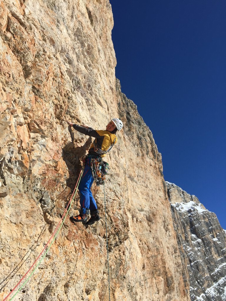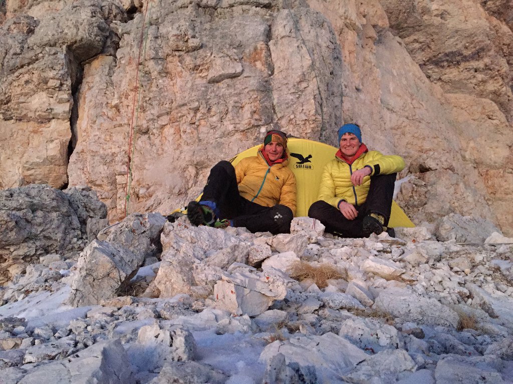 Da ich die Tour bereits 2007 mit meinen Bruder Manuel geklettert bin, konnte ich mich an die Linie in der Wand bestens erinnern. Die warmen Sonnenstrahlen, die uns am Wandfuß erreichten, hatten beinahe die selbe wohltuende Wirkung wie der Kaffee morgens in der Soctoni Hütte. Wie geplant, kletterten wir noch am selben Tag die ersten Längen und sofort war uns klar, dass wir am folgenden Tag mit unserer Biwakausrüstung zurückkehren würden.