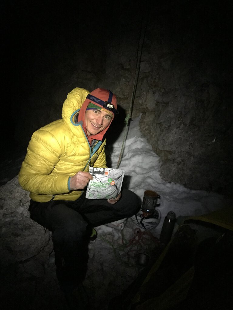 Erst am nächsten Morgen, nach einer Nacht mit Temperaturen von bis zu -18°C Grad, kam um 9:00 Uhr wieder Bewegung in unser Zelt. Gestärkt mit einem herzhaften Frühstück bestehend aus Schokolade-Müsli, gingen wir wieder zurück an unsere „Arbeit“. Die letzten Meter erwiesen sich als purer Klettergenuss. Um 11:30 Uhr standen wir auf den Pfeilerkopf: „Berg Heil, die zwua Lausa:-)“.